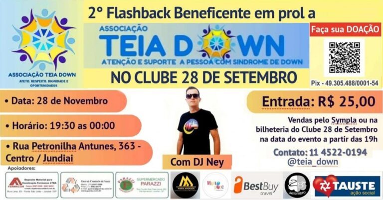 O 2° flashback beneficente da Teia Down, é um evento em prol a Associação de Pais Núcleo de Atendimento e Suporte a Pessoa com Síndrome de Down. A Teia Down é uma Entidade não governamental, sem fins lucrativos. Fundada há aproximadamente 3 anos, com foco no atendimento e acolhimento especializado a pessoas com Síndrome de Down.