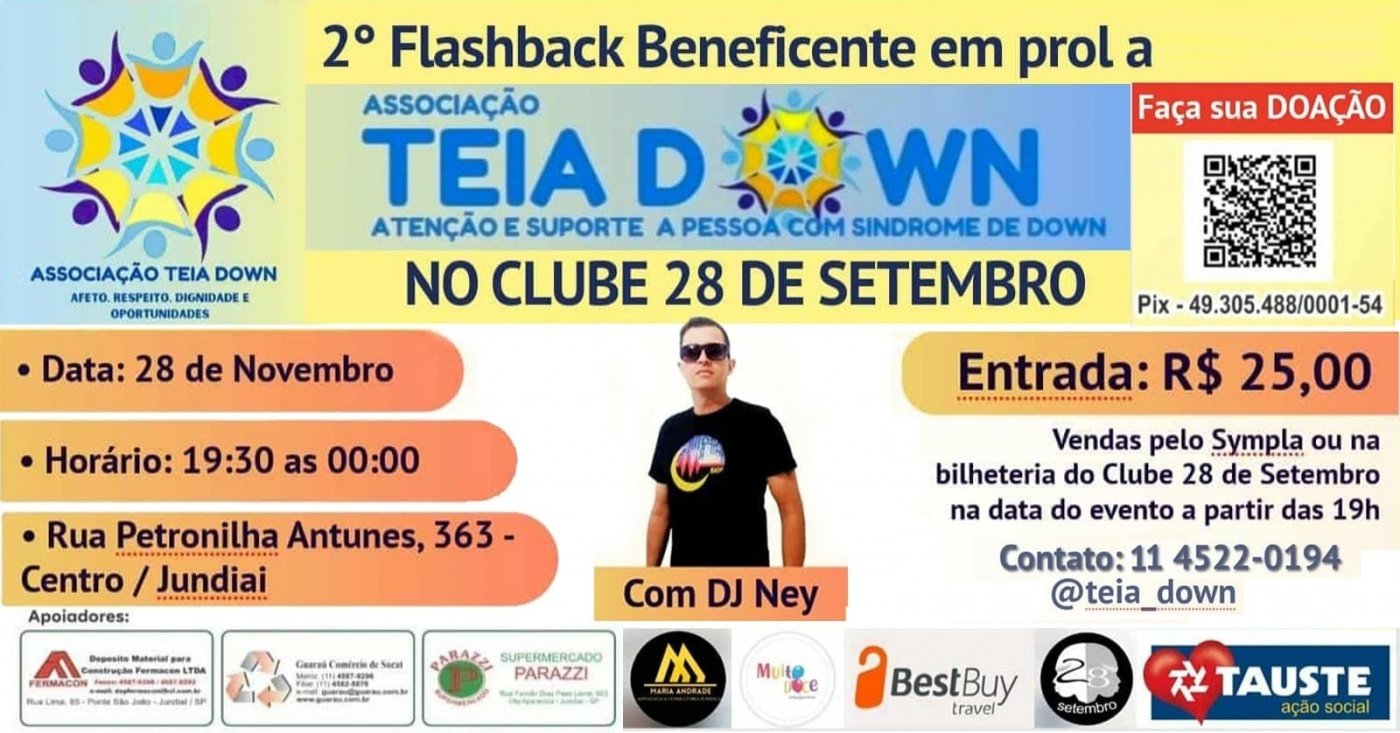 A Associação Teia Down Jundiaí convida a sociedade Jundiaiense e região, familiares, parceiros, voluntários, amigos, todos, para juntos nos divertir no 2° Flashback beneficente Teia Down.