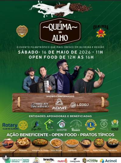 No dia 16 de maio, a partir das 12h, no Parque de Exposições de Oliveira, você vai viver uma experiência completa com comidas típicas, porções, porco no rolete, além de 3 grandes shows ao vivo: