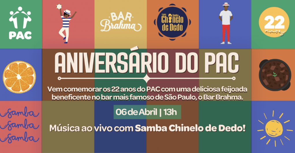 Venha celebrar os 22 anos do PAC com muita música, com o grupo Samba Chinelo de Dedo e uma feijoada deliciosa no bar mais famoso de São Paulo, o Bar Brahma!
