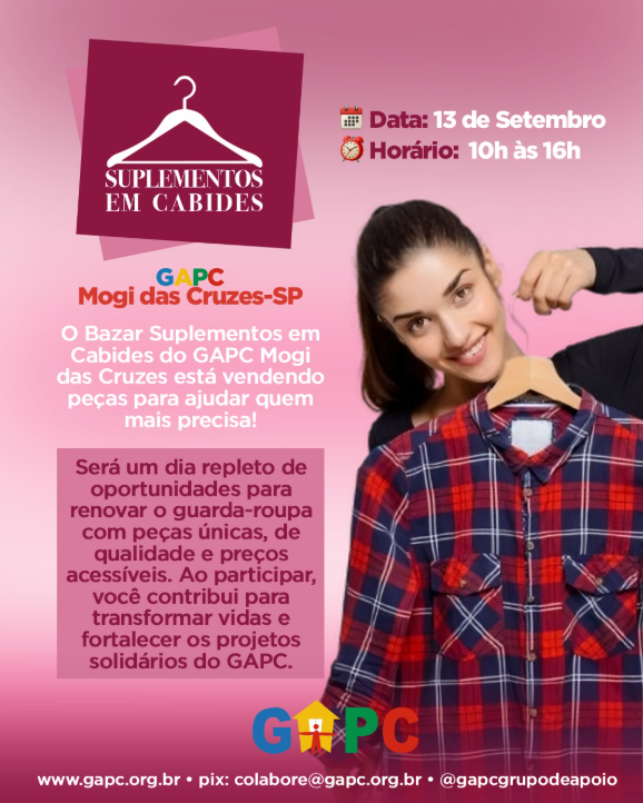 O Bazar Suplementos em Cabides do GAPC Mogi das Cruzes está vendendo peças para ajudar quem mais precisa!