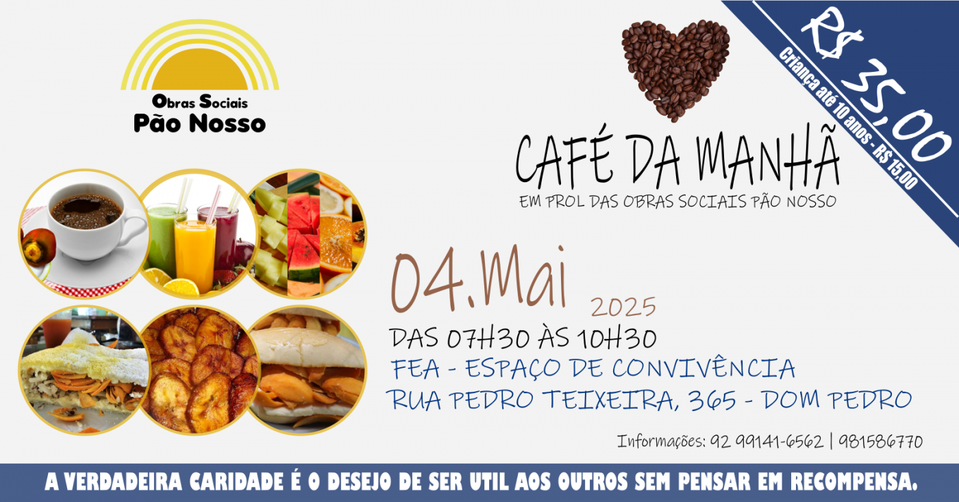 Participe do café da manhã beneficente das Obras Sociais Pão Nosso.