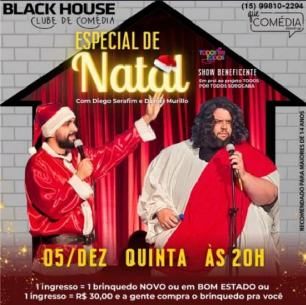 Um show de Stand-Up especial com temática natalina. A dupla Diego Serafim e Daniel Murillo promete muita diversão e risadas em um espaço aconchegante que também oferece porções e bebidas geladas.