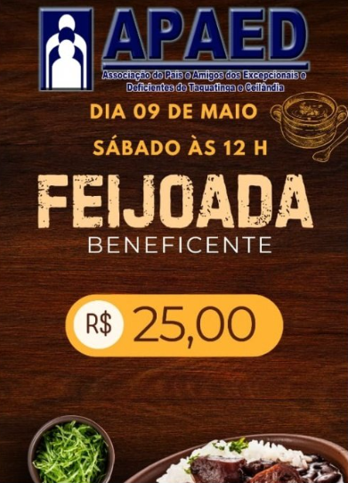 A APAED realizará, no dia 09 de maio, sua tradicional Feijoada Beneficente, um evento já consolidado e muito aguardado pela comunidade.