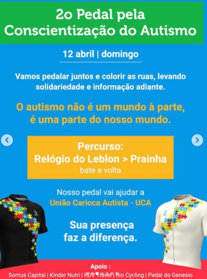 No dia 12 de abril, vamos pedalar juntos levando informação, inclusão e solidariedade pelas ruas. Parte da arrecadação será destinada em doação para a ONG União Carioca Autista, fortalecendo essa corrente do bem.
